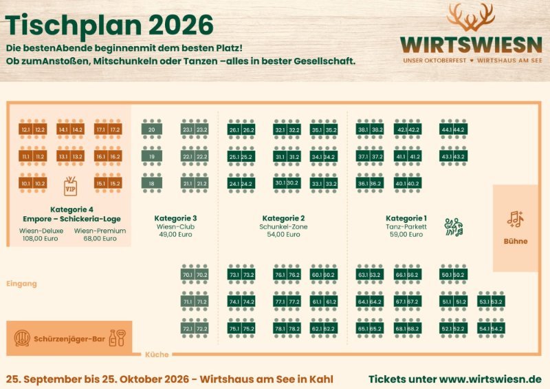 Willkommen auf der Wirtswiesn – wo Geselligkeit, Genuss und beste Stimmung aufeinandertreffen! Unser Festzelt bietet dir verschiedene Bereiche, damit du dein Wiesn-Erlebnis ganz nach deinen Wünschen gestalten kannst. Ob du ausgelassen tanzen, mit Freunden anstoßen oder in exklusiver Atmosphäre genießen möchtest – hier findest du den perfekten Platz für deinen Abend.